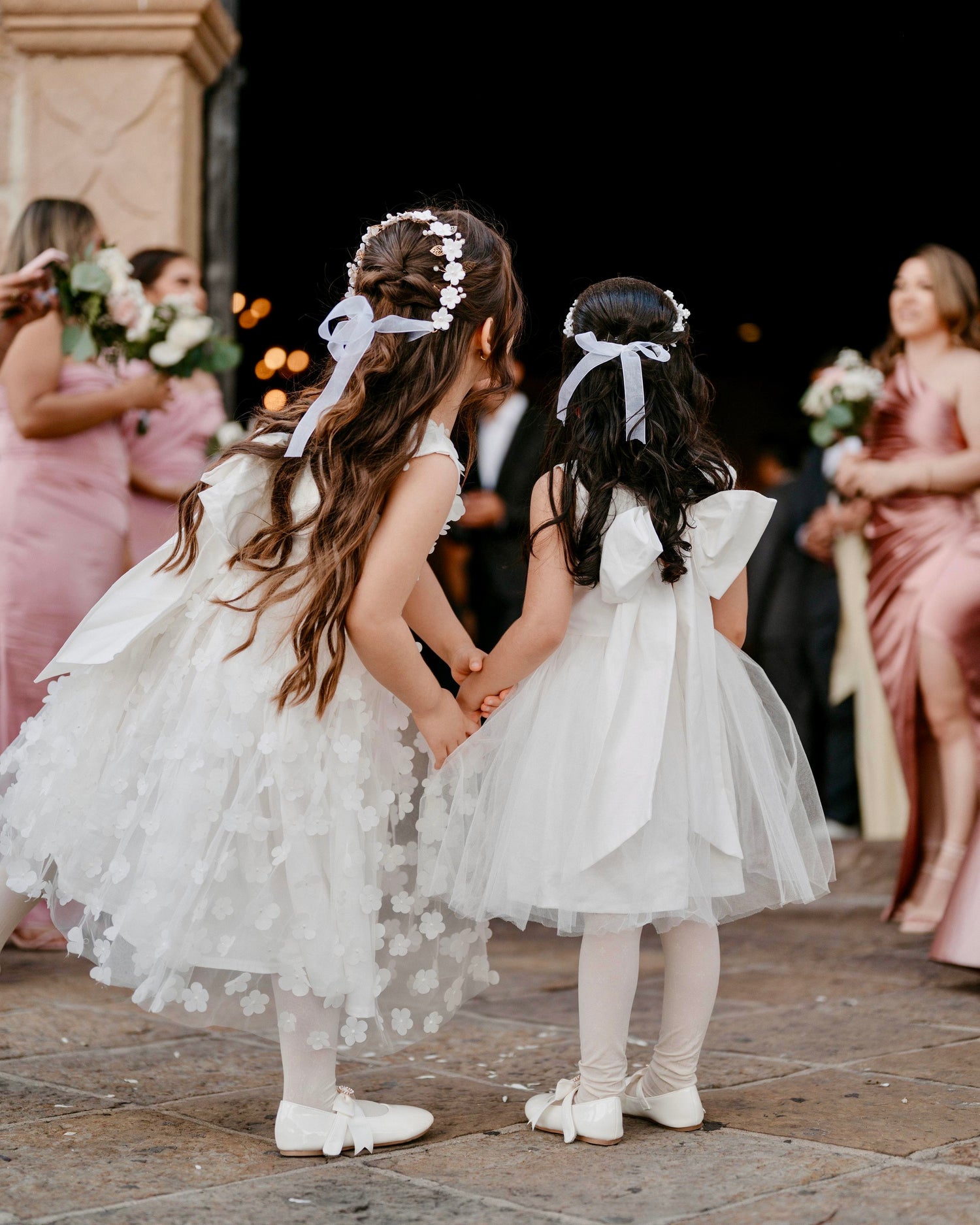 Esta hermosa boda tuvo 4 Pajecitas que lucieron un hermoso vestido blanco con encajes, acompañados de capas en terciopelo para el tema del frío.