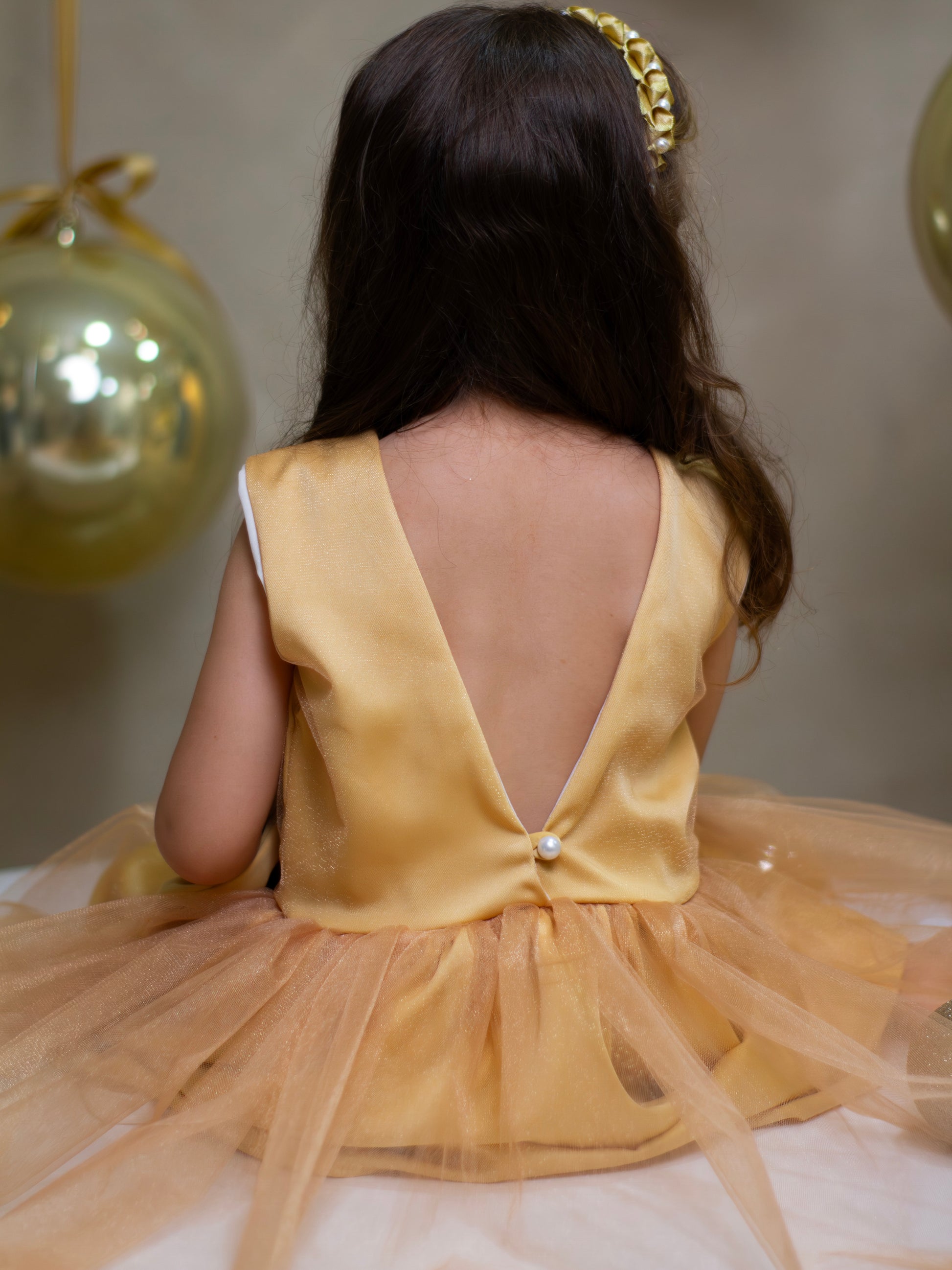 Vestido cuello redondo manga sisa, con escote en la espalda. Un moño adelante con perlas bordadas a mano, y una sobrefalda en tull.