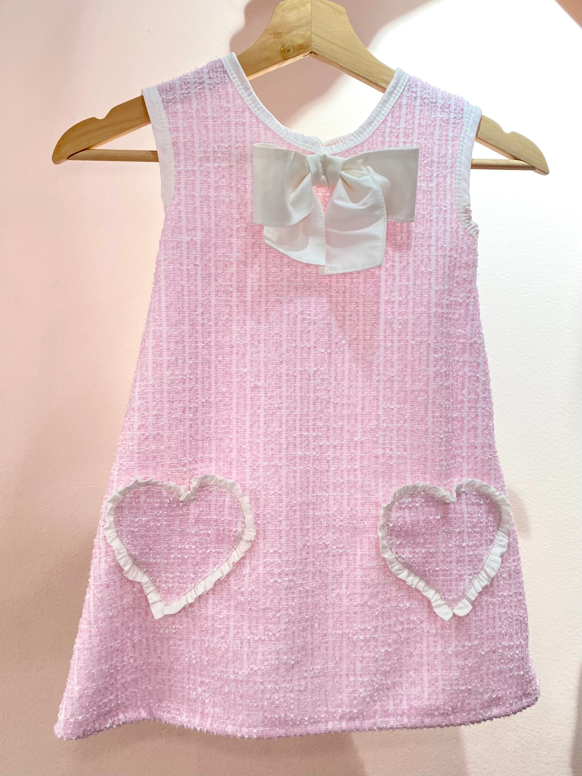 Vestido Josefina para niñas, tipo talego con cuello redondo adornado por un lazo decorativo. Con delicados corazones y fruncidos que realzan su diseño, está confeccionado en tela tweed para un acabado elegante y cómodo. Perfecto para destacar en cualquier evento.