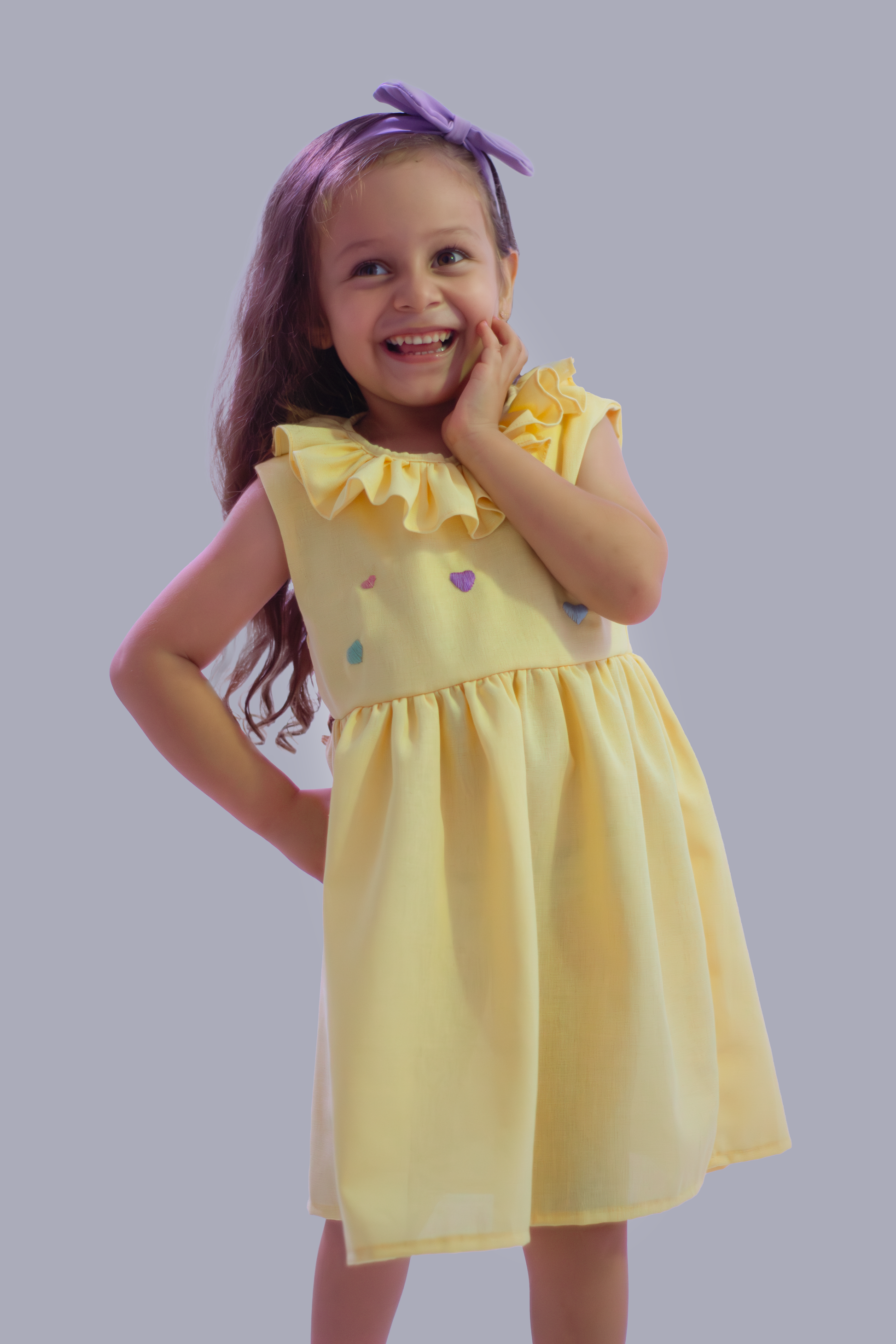 Vestido Ligia para niñas, con cuello redondo y golita delicada. Hecho en lino suave, destaca por sus corazones de colores bordados a mano que aportan un toque único y alegre. Ideal para ocasiones especiales o uso diario con estilo y comodidad.